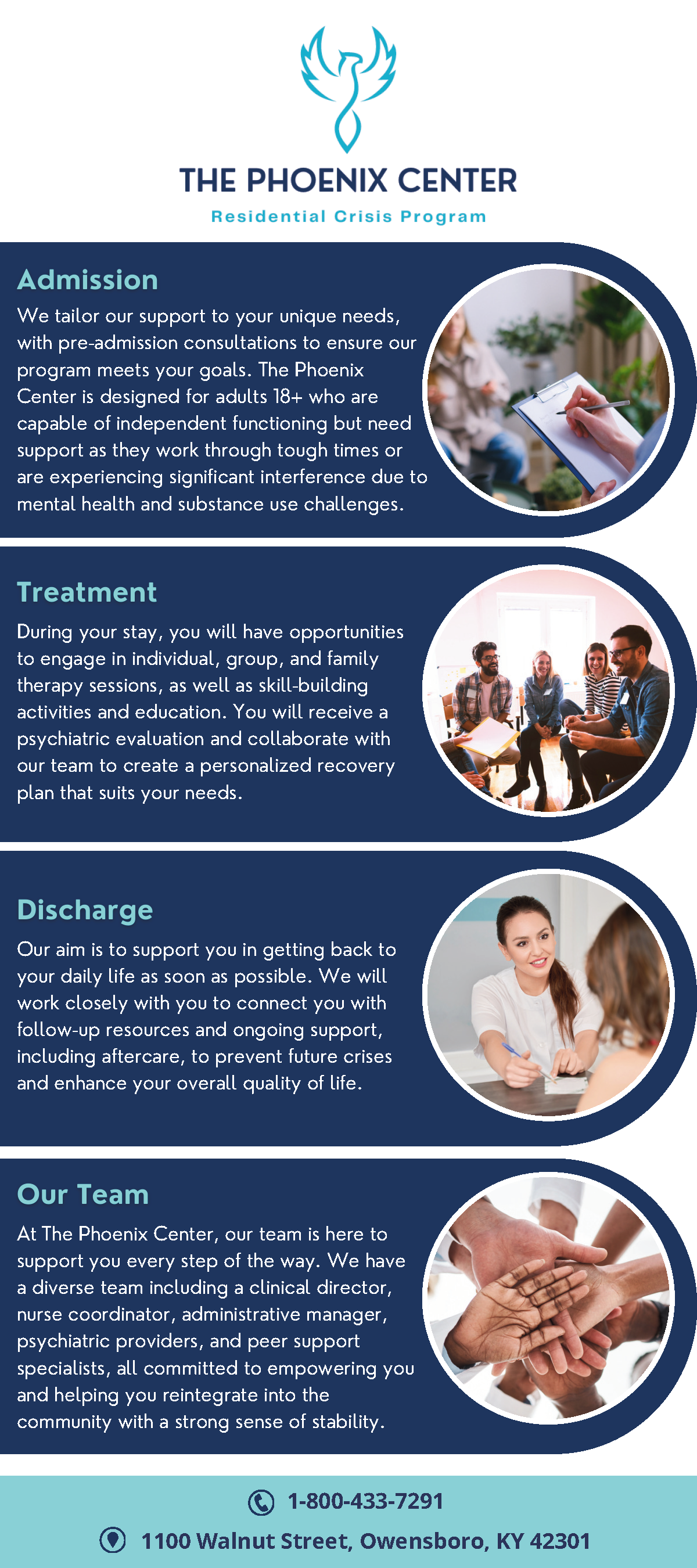 The Phoenix Center is a residential crisis program for adults located in Owensboro, Kentucky. We offer personalized, round-the-clock, intensive, short-term crisis support to help you stabilize and move towards recovery in a welcoming environment. Our aim is to provide you with a supportive atmosphere that is less confining than traditional inpatient options. Treatment includes individual, group, and family therapy, as well as skill-building acvities and education. You will receive a psychiatric evaluation and collaborate with our team to create a personalized recovery plan that suits your needs.