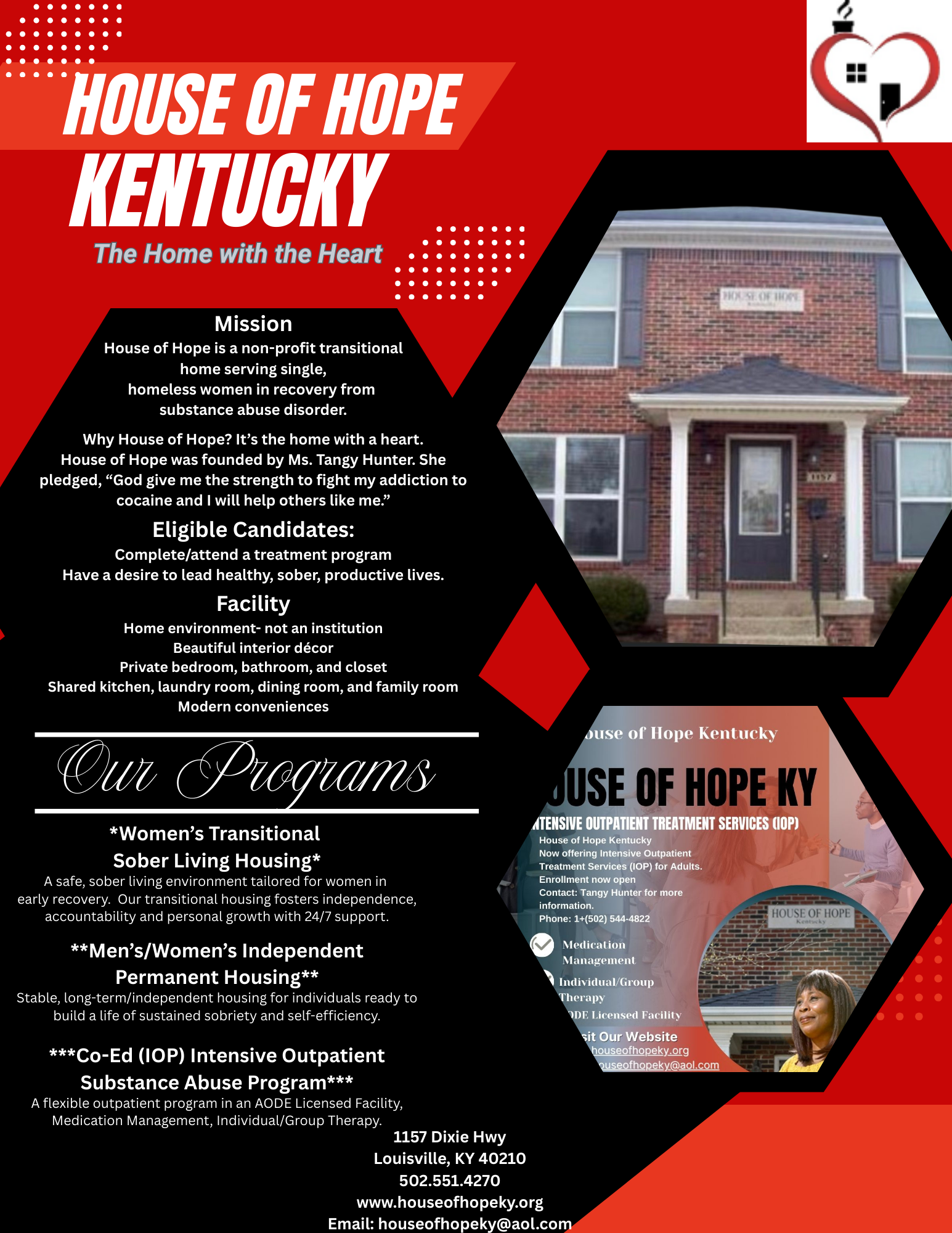 House of Hope Kentucky, Inc. retores and transforms the lives of single homeless women in recovery with substance disorder, providing them with transitional housing, compassionate care, support and life skills to help them become self-sufficient, productive citizens.