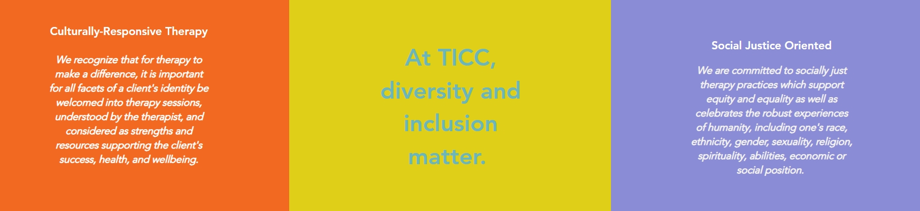 The mission of the Trauma-Informed Counseling Center is to provide meaningful therapeutic services and treatments in an inclusive environment to individuals from all walks of life. We strive to help each individual understand the multifaceted nature of trauma and how other mental health disorders outside of trauma do not have to control, or significantly impact the quality of life.