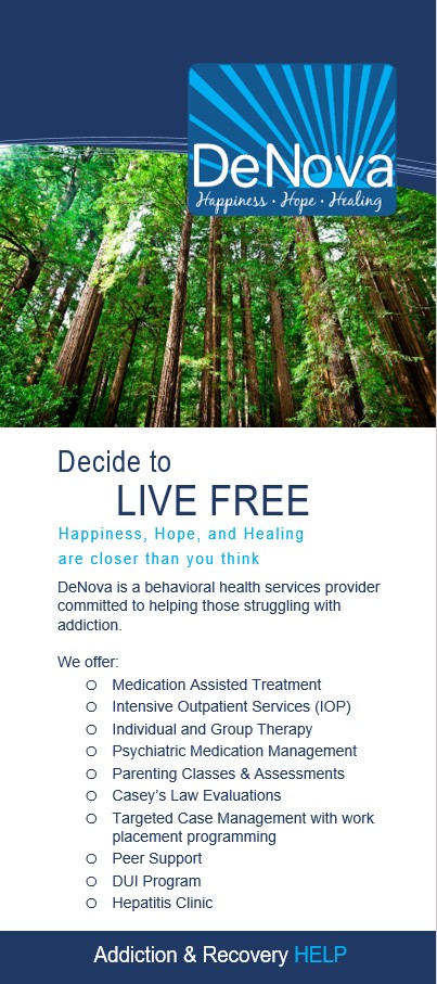 DeNova comes from a Latin phrase meaning “from the beginning”. Starting anew requires a determination to become sober and stay sober. Addiction is complex and is different for each person, based on individual characteristics and the addictive substance. The idea behind DeNova is to help to nurture a new attitude. DeNova’s protocols are customized to the needs of the patient. While we take into consideration many components of recovery, our clinicians focus on getting the patient to a productive state. Employment, faith, friends, and family are part of the critical success factors to recovery. A family setting can help give a patient the support network required to get and stay sober. Our professionals seek to understand the personal motivation factors that drive recovery and then provide clients with the mental and physical building blocks that start them on their journey to happiness, hope, and healing.