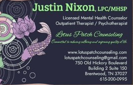 Lotus Patch Counseling is a welcoming therapy practice in Brentwood, Tennessee, offering individual counseling for adolescents (ages 16 and up) and adults. Led by Justin Nixon, LPC/MHSP (Licensed Professional Counselor/Mental Health Service Provider), Lotus Patch provides a safe and supportive space where clients can explore challenges, build resilience, and move toward greater well‑being. Justin’s approach is warm, compassionate, and evidence‑based, helping clients gain insights, develop practical coping skills, and feel more in control of their mental health. While in‑person therapy is ideal for building connection and creating a grounding environment, secure videoconference sessions are available for those who need the flexibility of meeting remotely. Areas of focus include: Mood Regulation: Support for depression, anxiety, anger management, and self‑harm Personality Disorders: Special expertise in Borderline Personality Disorder (BPD) Substance Use & Addiction Other Concerns: Intrusive thoughts, existential or spiritual struggles, and relationship challenges